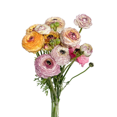 Ranunculus that look like they have been hand-painted in watercolor. Each petal is brushed with delicate streaks of blush, peach, buttercream, and purple, creating a dreamy swirl of pastel tones. No two blooms are ever the same, which makes every stem a little masterpiece. A flower that doesn't just bloom - it shows off! Now available at wholesale pricing and farm to door delivery.